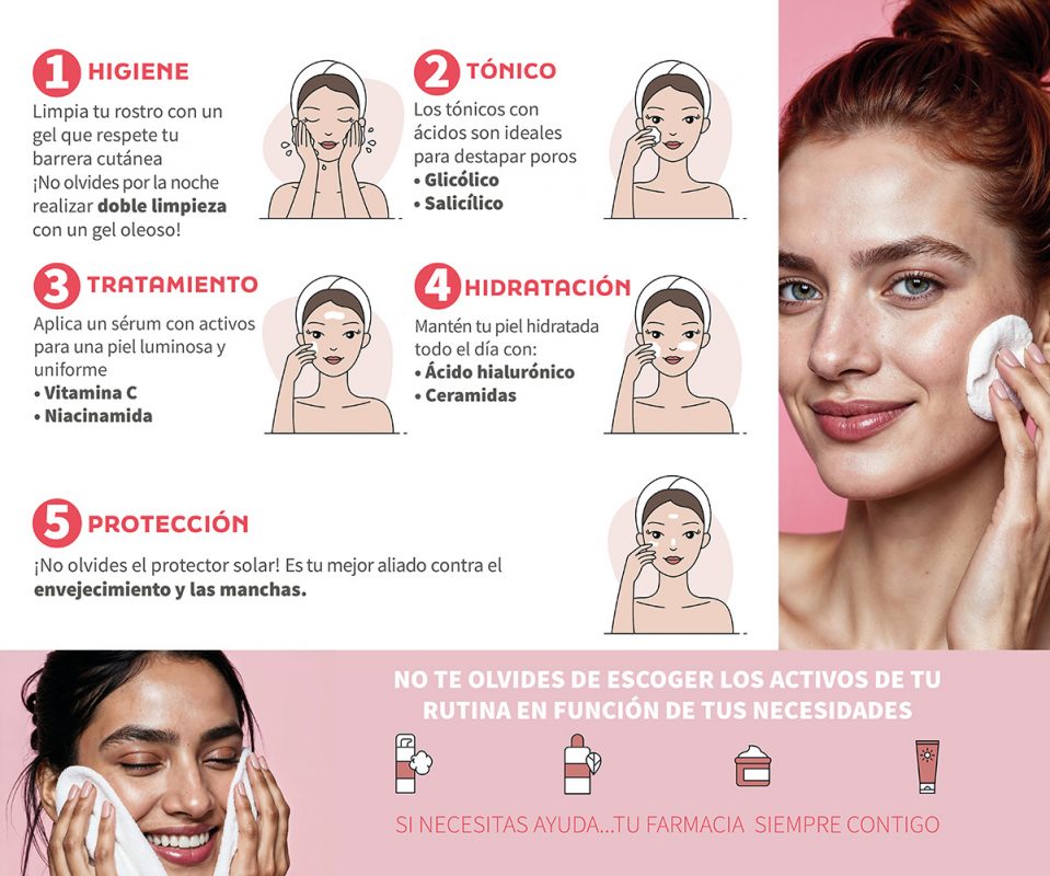 Descubre la rutina facial para una piel sana 🥰🥰🥰 No olvides elegir los activos en función de tus necesidades…Si tienes alguna duda, tu farmacia siempre contigo ❤